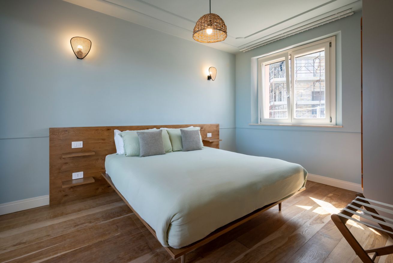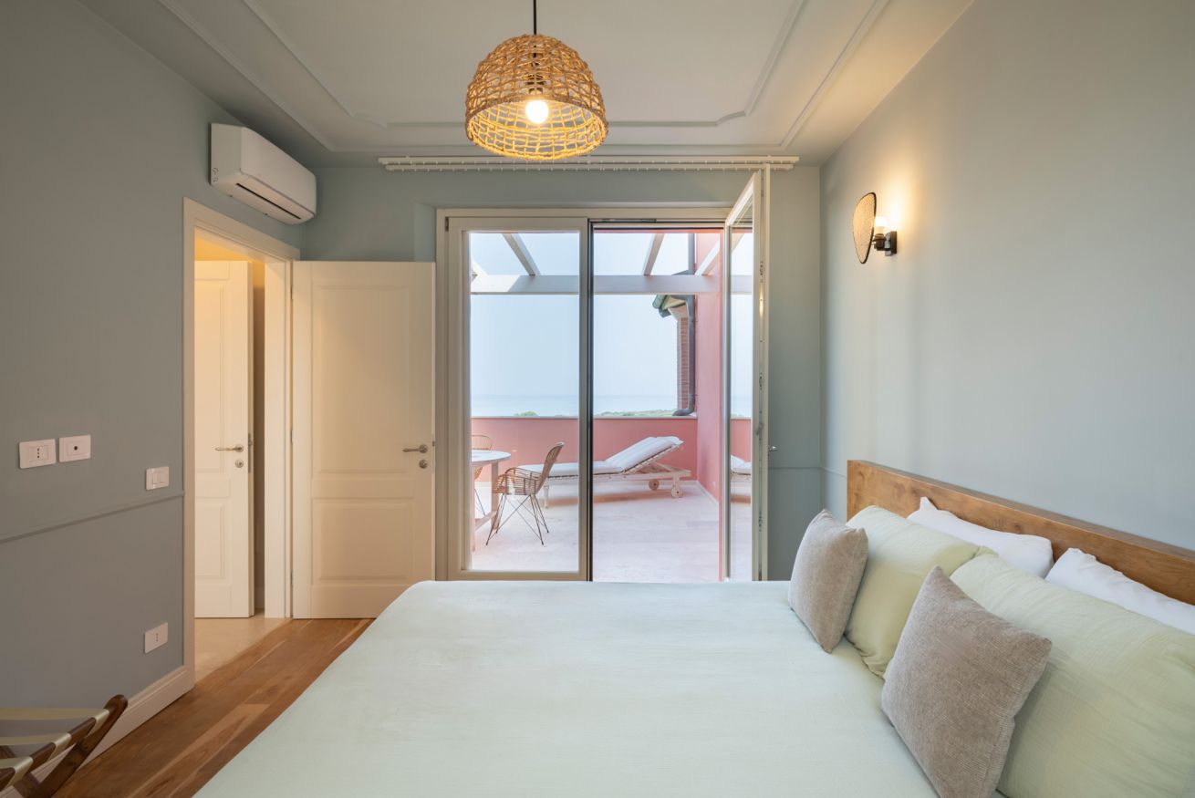 La zona notte ospita un letto king size con biancheria di alta qualità. Il bagno, completo e dotato di finestra, è realizzato in pietra naturale. L’ampia zona giorno è dotata di un comodo divano letto matrimoniale, Smart TV di ultima generazione e un sistema di climatizzazione all’avanguardia. Il terrazzo privato, con arredi da esterno, offre uno spazio perfetto per godere della bellissima vista sul mare.